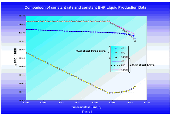 When the same typecurves (in Figure 1) are plotted against dimensionless material balance time, the late time portion of the constant pressure overlays the constant rate solution precisely. This is an important result because it illustrates that the same diagnostic plots used in pressure transient analysis can be inverted and used for rate transient analysis, provided that the material balance time function is used.