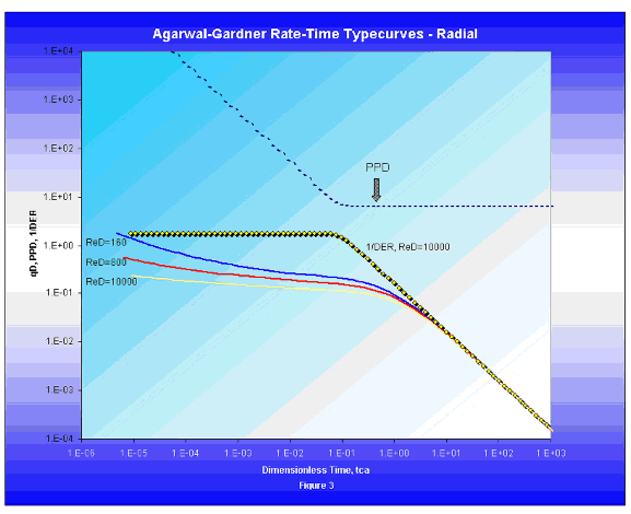 The presence of the inverse log derivative and pressure derivative plots on the A-G typecurve aids in the identification of transient and boundary dominated flow regimes, in the same way that the logarithmic pressure derivative aids in flow regime identification on welltest typecurves.