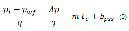 Equation (5), called the pseudo-steady state equation, suggests that a plot of Δp / q as a function of material balance time will yield a straight line. If we assume q is constant, then Equation (5) reduces to:
