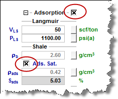 In shale reservoirs that display adsorption, it has traditionally been thought that the adsorbed gas resides in the matrix of the organic-rich portion of the rock, which does not contribute significantly to the porosity of the rock. New evidence (Ambrose et al.) is suggesting that this organic-rich portion of the shale does, in fact, contain the majority of the porosity, as well as the adsorbed gas. If this assumption is valid, it is possible that the adsorbed gas is occupying a portion of the measured porosity, thus decreasing the pore space available to free gas. The volume occupied by the adsorbed gas must therefore be subtracted from the measured pore volume when calculating the volume available for free gas storage. The Ads. Sat. (Adsorption Saturation) option in Harmony performs this correction.