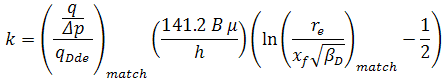 The calculation of parameters for the multi-well pool case is very similar to that of the single well typecurve analysis. However, total material balance time (and total material balance pseudo-time) is used in place of material balance time. In addition, a new variable βD is introduced. The dimensionless group reD / βD replaces reD as the typecurve matching parameter for the multi-well case. βD is defined as the ratio of total pool production to individual well production. Strictly speaking, this will vary with time; however it can be approximated as: