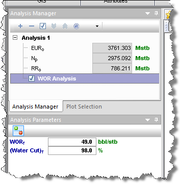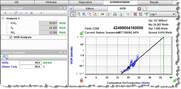 A WOR analysis can be added or displayed in an open worksheet while Cumulative Oil is on the x-axis, and at least one of the following is on the y-axis: WOR, WOR+1, or Water Cut. After you add a WOR analysis (see analyzing an entity), the selected analysis has its detailed parameters displayed in the Analysis Parameters pane.