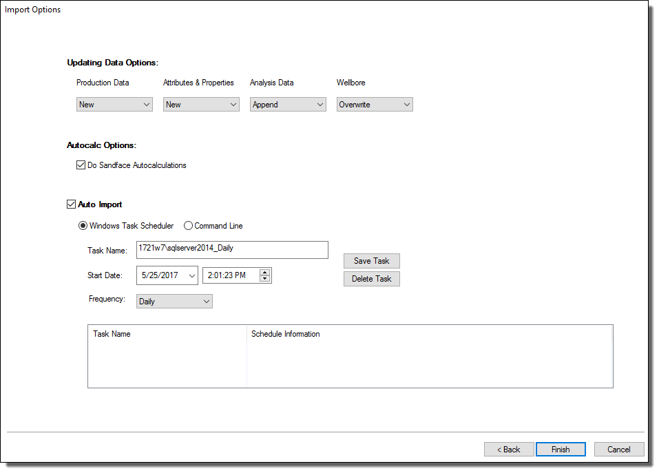 To schedule automatic well updates using the command line or the Windows task scheduler, click the Auto Import box.