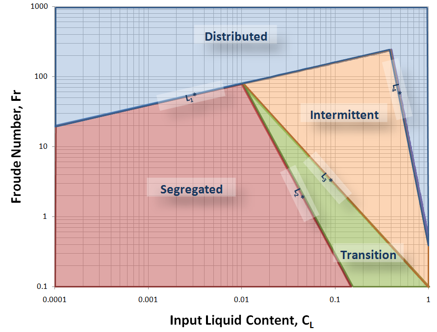 If none of the transition criteria for intermittent flow are met, the flow pattern is then designated as froth. Froth flow implies a transitional state between the other flow regimes.