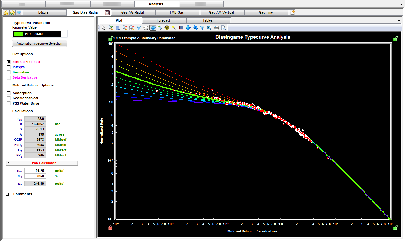 We recommend beginning the match with normalized rate data and typecurves. To add further confidence in the match, use the derivative, integral and derivative, or cumulative production (Fetkovich) options to provide a more unique analysis.