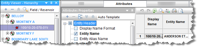 table. Harmony Enterprise displays a default selection of attributes (named Auto Template) when one or more wells are selected in the Entity Viewer.