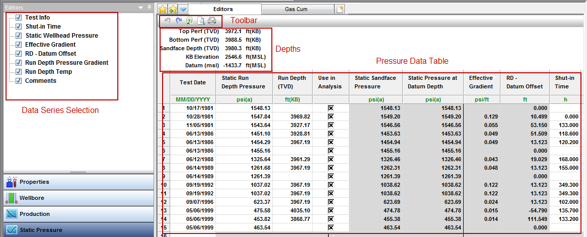 The Editors pane on the left-side has a list of data series that you can select to be displayed in the table. By default, all of the series are selected to be displayed. In addition, the following columns are always displayed (that is, they cannot be hidden): test date, static run depth pressure, run depth, use in analysis, static sandface pressure, and static pressure at datum).