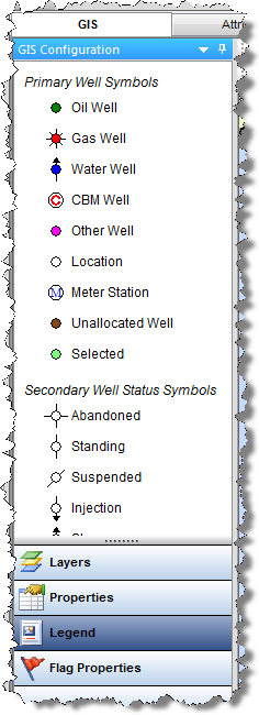 From left-to-right, the icons enable you to add an oil well (green), gas well (red), water well (blue), location (white), other well (pink), and coalbed methane (CBM) well to the GIS map.
