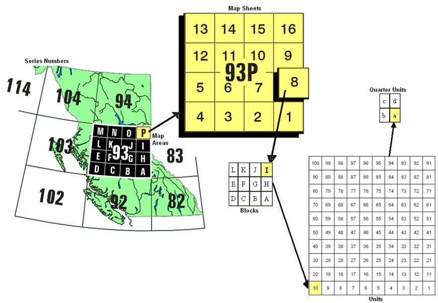 The series numbers identify rectangular areas that have a width of 8 degrees of longitude (width) and 4 degrees of latitude (north south). Series number 93 is located in the province of British Columbia.