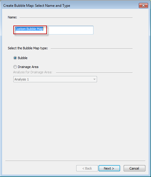 Type a name for your bubble map layer and click Next. If you create a bubble map with the same name, a number is incrementally added to the name (for example, custom bubble map 1, custom bubble map 2, and so on).