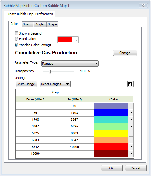 Bubble maps are represented as layers within the GIS tab, and can be selectively enabled or disabled like other layers. To create these graphic representations, a colored shape is overlaid on the entity. Both the color and the shape reflect one of the properties associated with the entity. As the value of the property changes, the color changes within a set range. In more complicated cases, multiple properties can be associated with different settings including variations in color, size, angle, and shape, according to the scale you set.