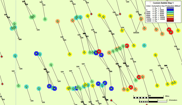 Bubble maps provide a means of graphically representing attributes and analyses associated with specific wells.
