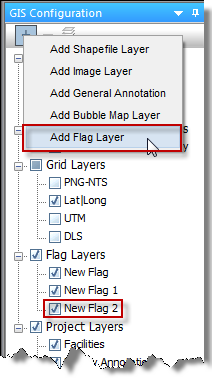 If you add a flag layer (click the + icon on the GIS Configuration pane), a corresponding node in the tree structure is added. You can show or hide flags by selecting or deselecting their checkboxes.