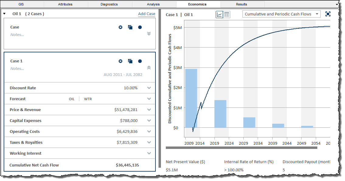 The Economics tab displays the economics for a well, scenario, or group of wells on a monthly basis, and you can run economics for multiple cases with multiple wells. Economics are calculated on a monthly basis by: