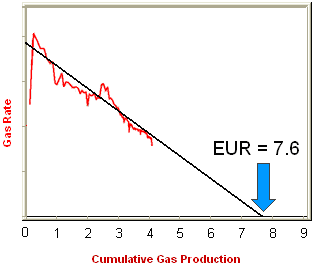 Typically, a decline analysis is conducted on a plot of rate versus time, or rate versus cumulative production (as shown in the figure above). The most commonly used trending equations are those first documented by J.J. Arps (1945). The following figure demonstrates a match trend and extrapolation to the EUR.