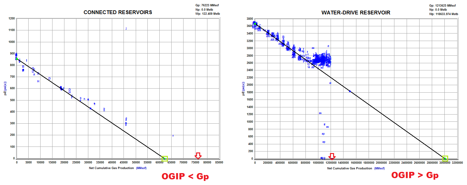 Another scenario which appears as pressure support on the p/Z plot is the connected reservoir model. The generic description is that two gas reservoirs are connected, described by a transfer coefficient between them, and gas feeds from one tank to the other as one of the tanks is depleted. This can be observed with two gas reservoirs with some communication, two zones in a reservoir with different permeability, or some barrier between them, or even another way of considering the situation of free and adsorbed gas in a reservoir. Because both water-drive and connected reservoirs show pressure support, it can be easy to mistake which model should be used. In a connected reservoir, the influx into the main reservoir is gas, as compared to an influx of water in water-drive. So the pressure support is accompanied by more gas in the reservoir, rather than a shrinking reservoir as in water-drive. Typically if the initial p/Z trend points to an original gas-in-place smaller than the cumulative production, a connected reservoir is the appropriate model to use.