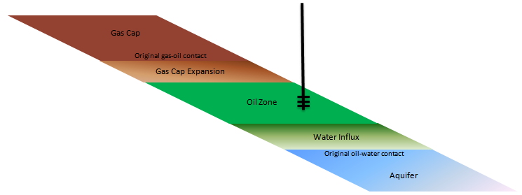 Gas expansion factor. For example, as the reservoir depletes, the gas cap expands into the reservoir volume previously occupied by oil. |