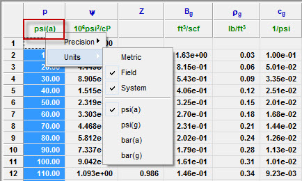 To change the precision and/or units displayed in a column, right-click the numeric columns’ headers (the columns displaying units in green text).