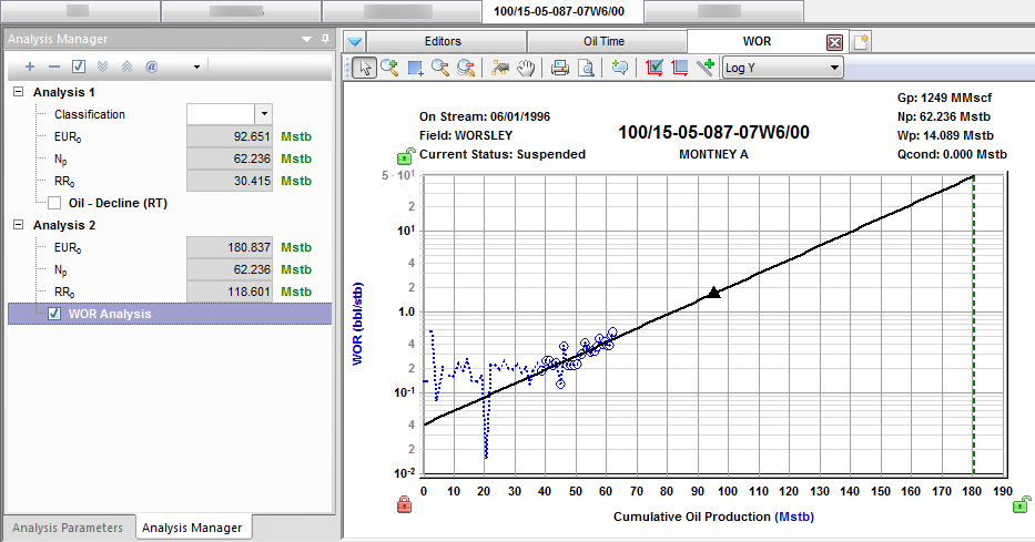 With water-oil ratio (WOR) worksheets you can use oil ratios vs. cumulative oil or vs. time, to forecast oil and water rates in a high-water cut. In these cases, abandonment criteria is often related to both oil and water production. By providing the total fluid rate, forecasts for oil and water are calculated.
