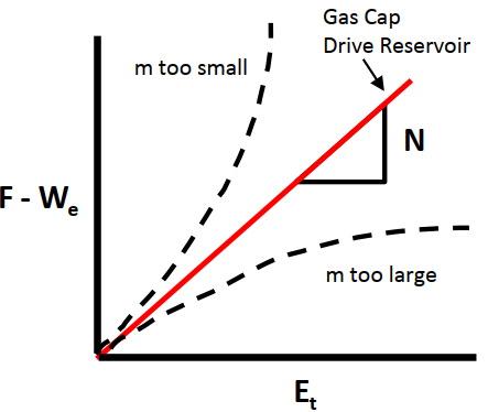 - Upward concave — indicates that the gas cap is too small. Adjusting m or G should linearize the points along the trend.