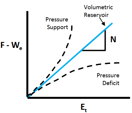 - Linear trend — a linear trend in the data indicates a volumetric expansion reservoir (solution gas or gas cap), provided the OOIP and OGIP are correct. The F vs. Et cannot independently determine the exact reason for pressure support, but it can assist in confirming the consistency of the solution.