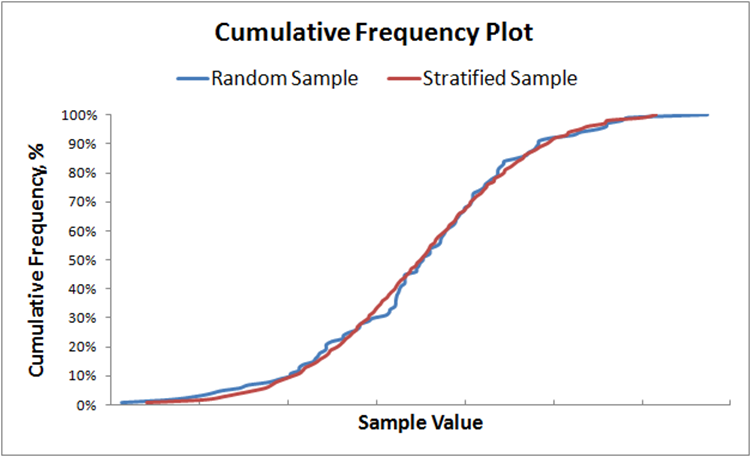 The effects of stratified sampling can be dramatic. The figure below compares the Cumulative Frequency Plot of 100 random samples with 100 stratified samples.
