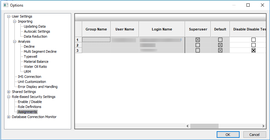 - User-defined roles — has full access to the rest of Harmony Enterprise along with a combination of any of the following four permissions: manage Security settings, import wells / update wells from IHS Markit, delete wells, modify editors, and modify security attributes (if Well Security is enabled).
