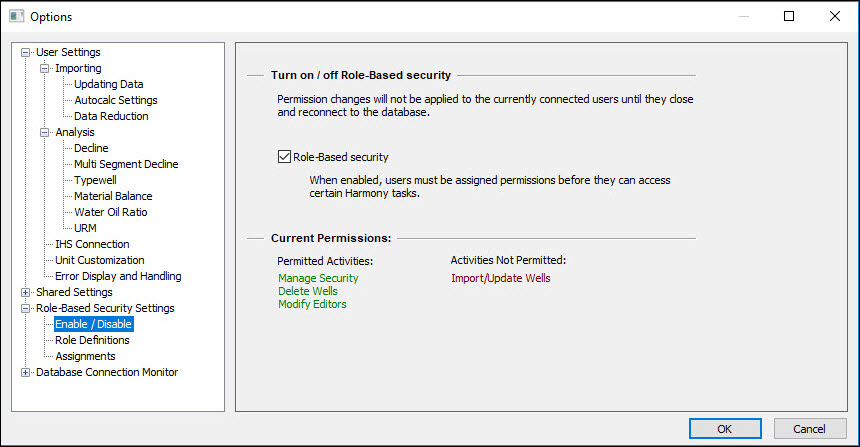 Role-based security is set in the Options dialog box, under the Role-based Security Settings node. To determine your permissions for your current session, click the Enable / Disable node. Any activities that are not allowed are displayed in red text under the Activities Not Permitted heading.
