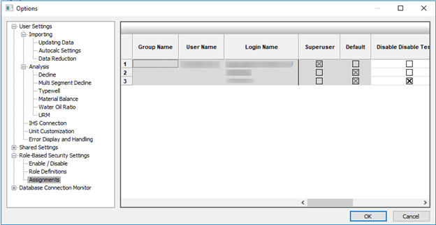 - User-defined roles — has full access to the rest of Harmony Enterprise along with a combination of any of the following permissions: manage Security settings, import wells / update wells from IHS Markit, delete wells, delete scenarios, modify editors, modify existing database connections, extract to .hldb files, and modify security attributes (if Well Security is enabled).