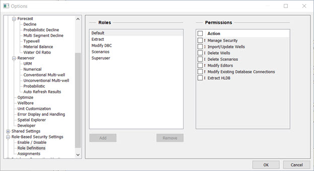 - User-defined roles — has full access to the rest of Harmony Enterprise along with a combination of any of the following permissions: manage Security settings, import wells / update wells from IHS Markit, delete wells, delete scenarios, modify editors, modify existing database connections, extract to .hldb files, and modify security attributes (if Well Security is enabled).