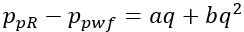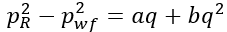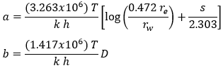 In general, values for “a” and “b” are determined from a well test (for example, isochronal test). If no well test is available, then the equations can be re-written in terms of reservoir parameters.
