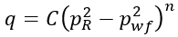 C = constant, MMscfd /(psi2)n or (103m3/d/kPa2)n