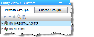 The Entity Viewer - Custom displays private groups and shared groups. You can create custom groups from your list of wells in the hierarchy based on locations and groupings that are not possible within the hierarchy structure.