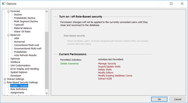 Role-based security is set in the Options dialog box, under the Role-based Security Settings node. To determine your permissions for your current session, click the Enable / Disable node. Any activities that are not allowed are displayed in red text under the Activities Not Permitted heading.
