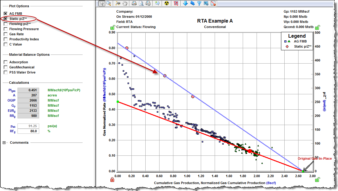 - in single-phase mode (when the Multiphase (Pseudo-Pressure) option is deselected) — Static p/Z** is plotted against Cumulative Gas production. A straight line drawn through this data defines OGIP. Estimates of OGIP based on flowing pressures and static pressures should be consistent.