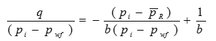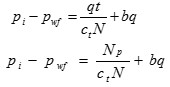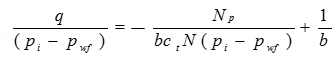 This is the FMB equation that is represented in the Agarwal-Gardner (A-G) plot: Plotting the left-side against {…} results in an x-intercept of N (original-oil-in-place), and a y-intercept of 1/b (Productivity Index).