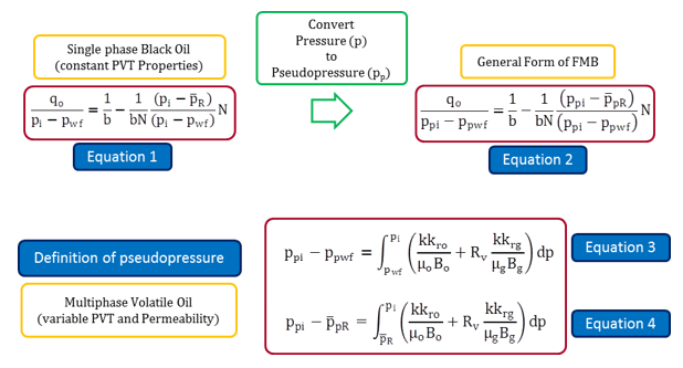 Multiphase FMB parallels the single-phase methodology. In simple terms, single-phase FMB was derived for oil (in terms of pressure). Multiphase FMB uses the same format of equations, but replaces pressure by a pseudo-pressure that accounts for the variations in pressure, volume, and temperature (PVT) properties, saturation changes, relative permeability, and individual flowing phases.