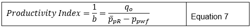 viii: The productivity index varies during transient flow, but becomes constant during boundary-dominated flow. Because the pseudo-productivity index is defined in terms of pseudo-pressures, variations in saturation and relative permeabilities are accounted for (albeit in an approximate manner). As a result, the pseudo-productivity index becomes a constant (dependent only on reservoir shape, size, initial permeability, initial saturations, and well completion, which are all considered to be constant).