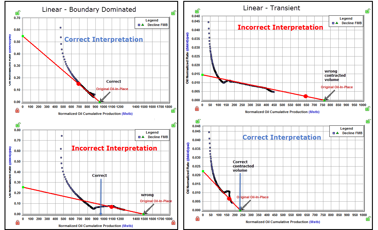 - When analyzing multiphase production data in FMB, it is possible to generate an incorrect straight-line trend by increasing the volume in place. The recommended procedure is to select the minimum value of original-oil-in-place, which results in an A-G Analysis straight line. This issue becomes more critical when analyzing data that is still in transient flow, especially when the bubble / dew-point pressures are hit before the boundary-dominated flow is reached. An example of incorrect and correct interpretation is shown below (see item h).