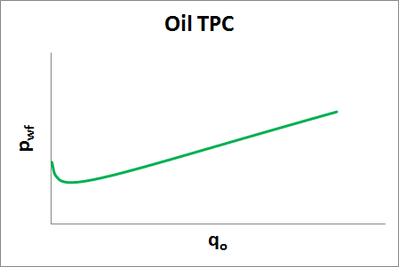 A TPC is a graphical representation of the pressure response of a wellbore completion to a range of fluid rates. The TPC is plotted as a relationship between sandface flowing pressure versus oil rate.