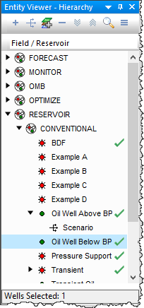 The Entity Viewer - Hierarchy displays the entities in a project, which you can view, sort, and select for analysis. Note that there is a well count at the bottom, which counts wells and scenarios (but not groups).