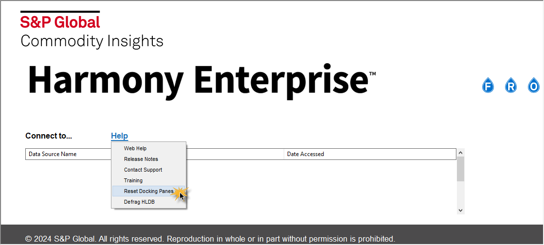 Reset Docking Panes — (only visible from the startup screen) closes Harmony Enterprise and resets your docking panes to the original settings.