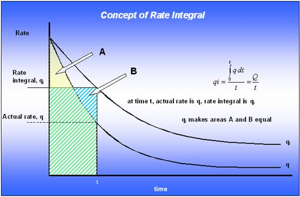 Conceptually, the rate integral function can be thought of as a cumulative average of the flow rate with time. The purpose of plotting a rate integral function is to smooth noisy rate data. This concept is most easily understood graphically: