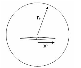 For FCD > 50, the fracture is assumed to have infinite conductivity. The finite conductivity fracture model in RTA simulates a vertical fracture in the center of a cylindrical reservoir. The characteristic parameter reD = re / xf represents the ratio of external reservoir radius to fracture half length.