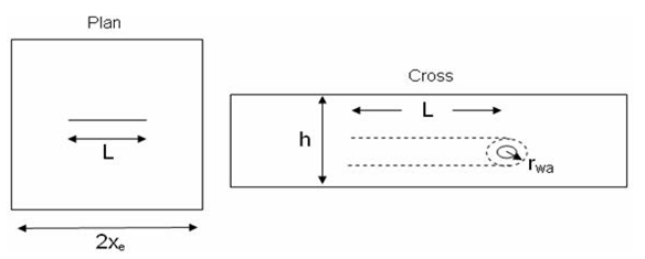 The procedure for matching horizontal wells is similar to that of vertical wells. However, for horizontal wells, there is more than one choice of model. Each model presents a suite of typecurves representing a different penetration ratio (L / 2xe) and dimensionless wellbore radius (rwD). The definition of the penetration ratio is illustrated in the following diagram: