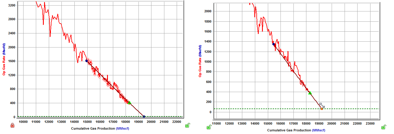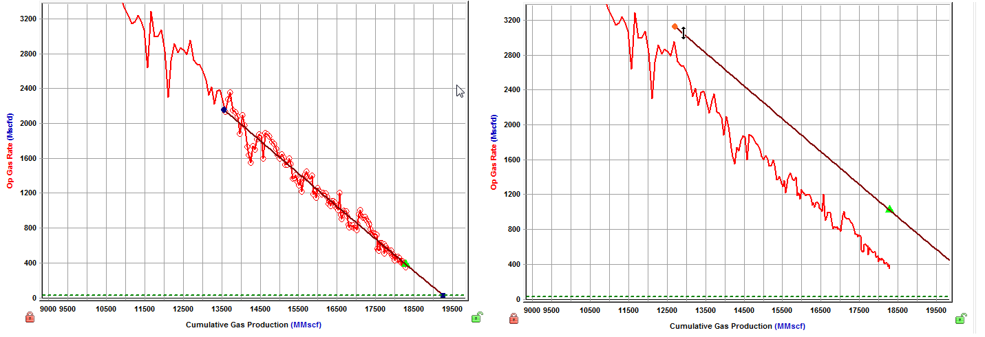 To change the initial cumulative production and final cumulative production, click-and-drag the left point while holding down the Ctrl key. This changes the start point without changing the initial oil / gas rate or decline rate.
