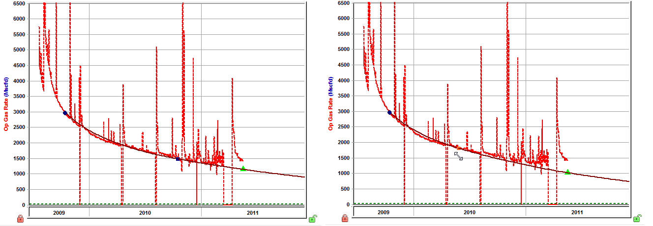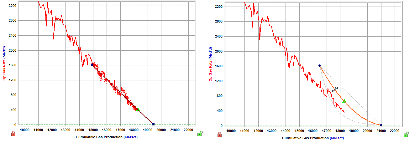 All line manipulations described above can be applied to the multi-segment decline analysis. The length of the first decline segment can be changed by clicking the end point of the first segment and dragging left or right.