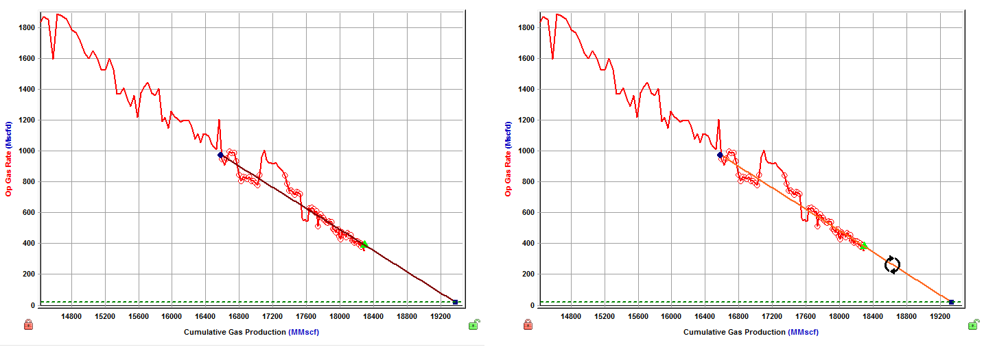 To change the final cumulative production and the decline rate, drag the end point left or right. This changes the cumulative production of the segment and the forecast duration, without changing the final rate. The initial gas / oil rate and decline rate are also changed.