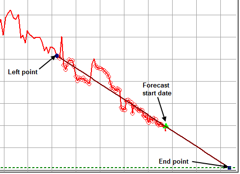 Left point — any historical data point. (The section between the left point and the forecast start date is not included in the forecast; it is only used to show the match to historical production.)