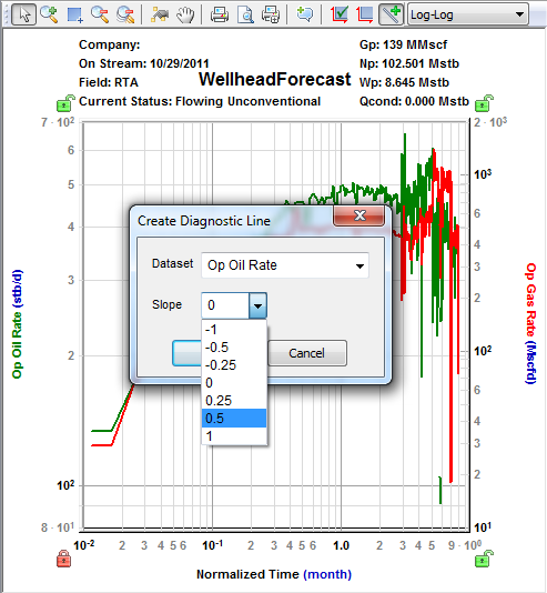 A diagnostic line requires at least one dataset or forecast. If there are multiple datasets, a popup opens where you can associate the diagnostic line with a data series. If that data series has one of its axes scaled, the diagnostic line scales with it.